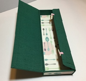 オードブル用のお皿を入れるギフトケースとして、麻のグリーンのクロスとコーディネート
